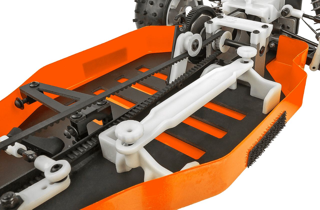 - Aluminum bulkhead, motor mount, rear hubs, and steering knuckles