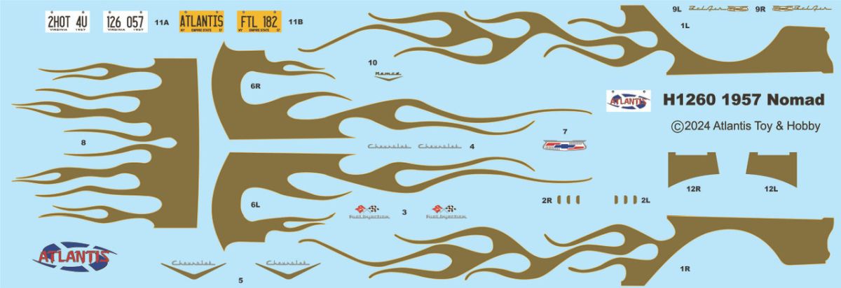 About your 1957 Chevrolet Nomad: It all started at the 1954 Autorama Show. General Motors was displaying vehicles "From the Future" as well as their current models. The lines that formed around one of these 'Future' vehicles - a deluxe station wagon - convinced them to go into production on the Chevrolet Nomad. The Nomad was the special and sporty Chevrolet 2-door sports station wagon, with 1957 as its last and final build in a three year run. The name Nomad continued but as a 4-door model from 1958 on and sold far better than in the 2-door style. All 2-door style tri-five Nomads are very collectible today and are especially highly prized as factory originals. Just 6,103 Nomad models were built for 1957, with a total three year model build of 22,375 units. The Atlantis release of the sleek 1957 Nomad captures the excitement of the late '50s drive-in scene. It is loaded with details like a small-block Chevrolet V-8 which can be done 2 ways, an opening hood, hinged rear tailgate, and rotating wheels. Build it with stock Bel Air hubcaps or the chrome reverse wheels. It comes with beautiful flame decals similar to the famous Hollingsworth Nomad.